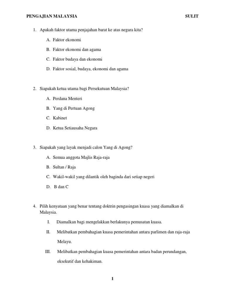 Penggal 1 kertas 1 Penggal 2 Kertas 2 dan Kertas 4 manakala kertas 3 di penggal 3. Tingkatan 1 Sejarah Contoh Soalan Bahagian C. Raja bertindak atas nasihat Perdana Menteri.